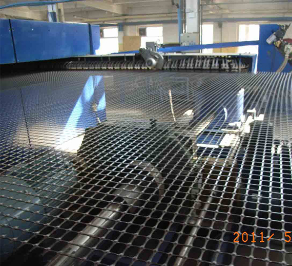 雙向拉伸塑料土工格柵是以聚丙烯(PP)或聚乙烯(PE)為原料,經(jīng)塑化擠出板材、沖孔、加熱、縱向拉伸、橫向拉伸而成。該材料在縱向和橫向上都具有很大的拉伸強度,這種結(jié)構(gòu)在土壤中能夠提供一個更為有效的力的承擔(dān)和擴散的理想連鎖系統(tǒng),適應(yīng)于大面積承載的地基補強。