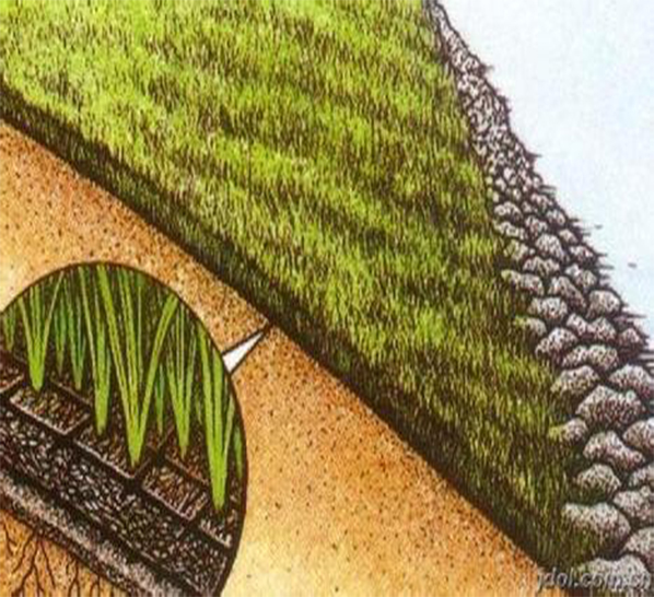 三維植被網是以熱塑性樹脂為原料,采用科學配方,經擠出、拉伸等工序精制而成。它無腐蝕性,化學性穩(wěn)定,對大氣、土壤、微生物呈惰性。該產品底層為一個高模量基礎層,采用雙向拉伸技術,其強度高,足以防止植被網變形,并能有效防止水土流失。表層為一個起泡層,膨松的網包以便填入土壤、種上草籽幫助固土,這種三維結構能更好地與土壤相結合。在邊坡防護中使用三維植被能有效地保護坡面不受風、雨、洪水的侵蝕。該產品功能是有利于植被生長。隨著植被的形成,它的主要功能是幫助草根系統(tǒng)增強其抵抗自然水土流失能力。
