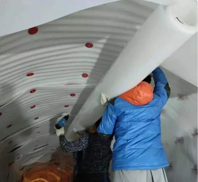 隧道EVA吊掛式防水板的安裝方法是:先在基礎(chǔ)表面涂刷專用膠水,然后將防水板吊掛在基礎(chǔ)表面上,并用專用膠水將各板材粘接在一起,最后用專業(yè)工具在板材連接處進行密封處理。該防水板施工完畢后,可在其表面覆蓋一層防護層,以保護其不受外力破壞和污染。