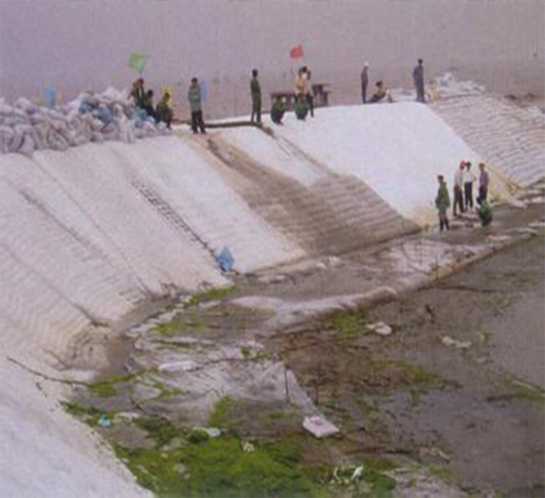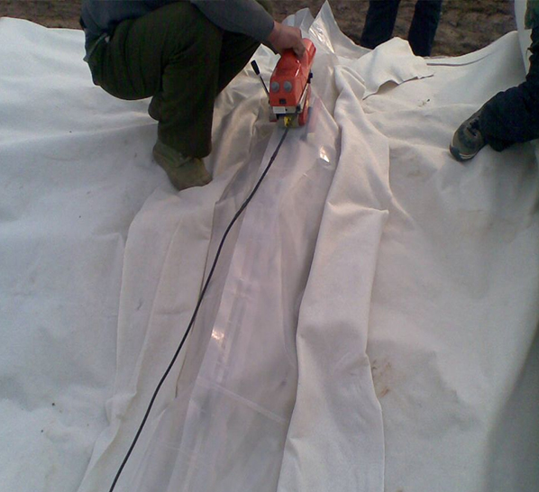 兩布一膜是以塑料薄膜作為防滲基材,與無紡布復(fù)合而成的土工防滲材料。它的防滲性能主要取決于塑料薄膜的防滲性能。目前防滲應(yīng)用的塑料薄膜,主要有聚氯乙烯(PVC)和聚乙烯(PE),它們是一種高分子化學(xué)柔性材料,比重較小,延伸性較強(qiáng),適應(yīng)變形能力高,耐腐蝕,耐低溫,抗凍性能好。膜的厚度一般為0.30-2.00mm。主要機(jī)理是以塑料薄膜的不透水性隔斷土壩漏水通道,以其較大的抗拉強(qiáng)度和延伸率承受水壓和適應(yīng)壩體變形。而無紡布亦是一種高分子纖維化學(xué)材料,通過針刺或熱粘成形,具有較高的抗拉強(qiáng)度和延伸性。目前應(yīng)用于復(fù)合的無紡布只要有:滌綸短纖針刺土工布、聚酯長絲紡粘土工布、扁絲塑編布等。它與塑料薄膜結(jié)合后,不僅增大了塑料薄膜的抗拉強(qiáng)度和抗穿刺能力,而且由于無紡布表面粗糙,增大了接觸面的摩擦系數(shù),有利于復(fù)合土工膜及保護(hù)層的穩(wěn)定。同時(shí),它們對(duì)細(xì)菌和化學(xué)作用有較好的耐侵蝕性,不怕酸、堿、鹽類的侵蝕。