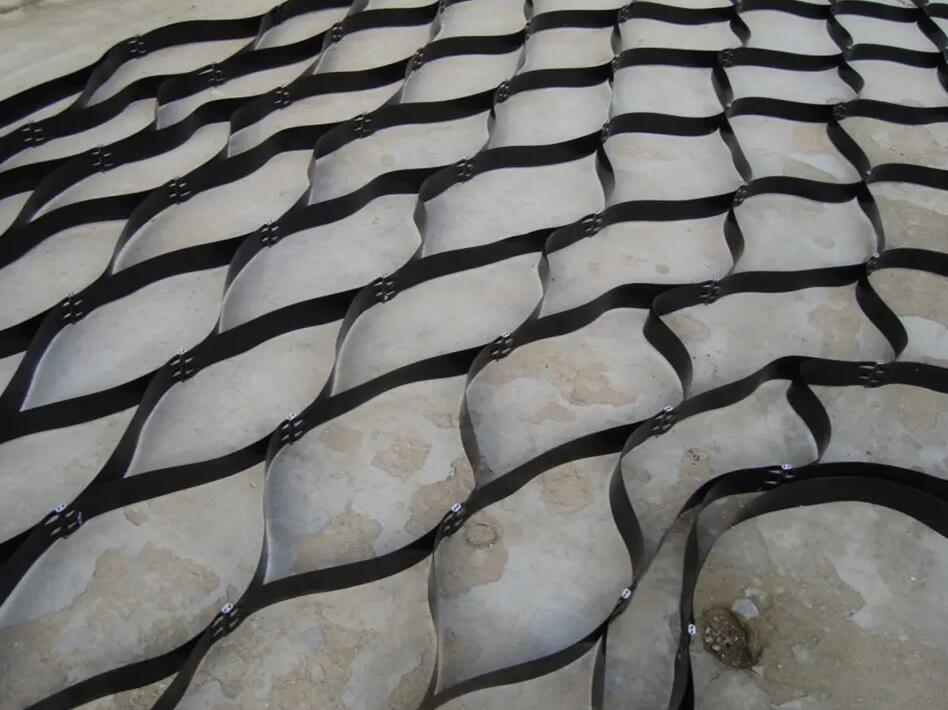 土工格室是由高強度的HDPE或PP共聚料寬帶,經過強力焊接或鉚接而形成的一片網狀格室結構。它伸縮自如,運輸時可縮疊起來,使用時張開并又充填土石或混凝土料,構成具有強大側向限制和大剛度的結構體。它可用來做為墊層,處理軟弱地基增大地基的承載能力,也可鋪設在坡面上構成坡面防護結構,還可以用來建造支擋結構等。